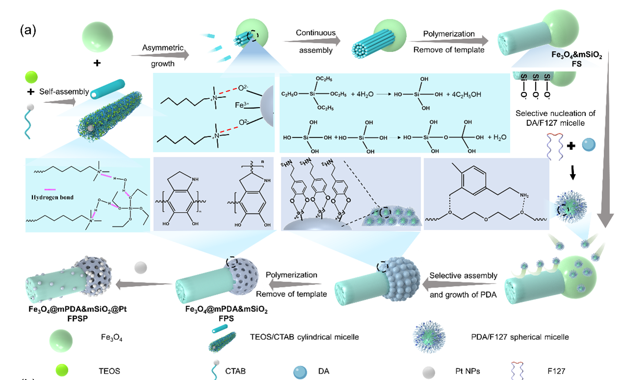 癌症早期诊断对提高治愈率至关重要,但传统免疫传感器在低浓度分析物检测中灵敏度不足。针对这一挑战,团队创新性地将自驱动纳米马达引入免疫传感体系,通过构建具备磁性、光热性、孔结构和催化活性的非对称纳米马达,实现了高效抗原捕获与信号放大。该团队以乳腺癌标志物CA153为模型,通过红外光照诱导纳米马达产生热泳运动,显著提高了抗体标记与抗原分子的碰撞概率,捕获效率相比静态标签提升95.8%。研究中,团队利用选择性界面自组装技术实现了Fe₃O₄、介孔二氧化硅、聚多巴胺及铂纳米酶的多组分精确空间分布,构建了具有多通道信号输出(比色、光热及催化)的双介孔非对称纳米结构(图1)。