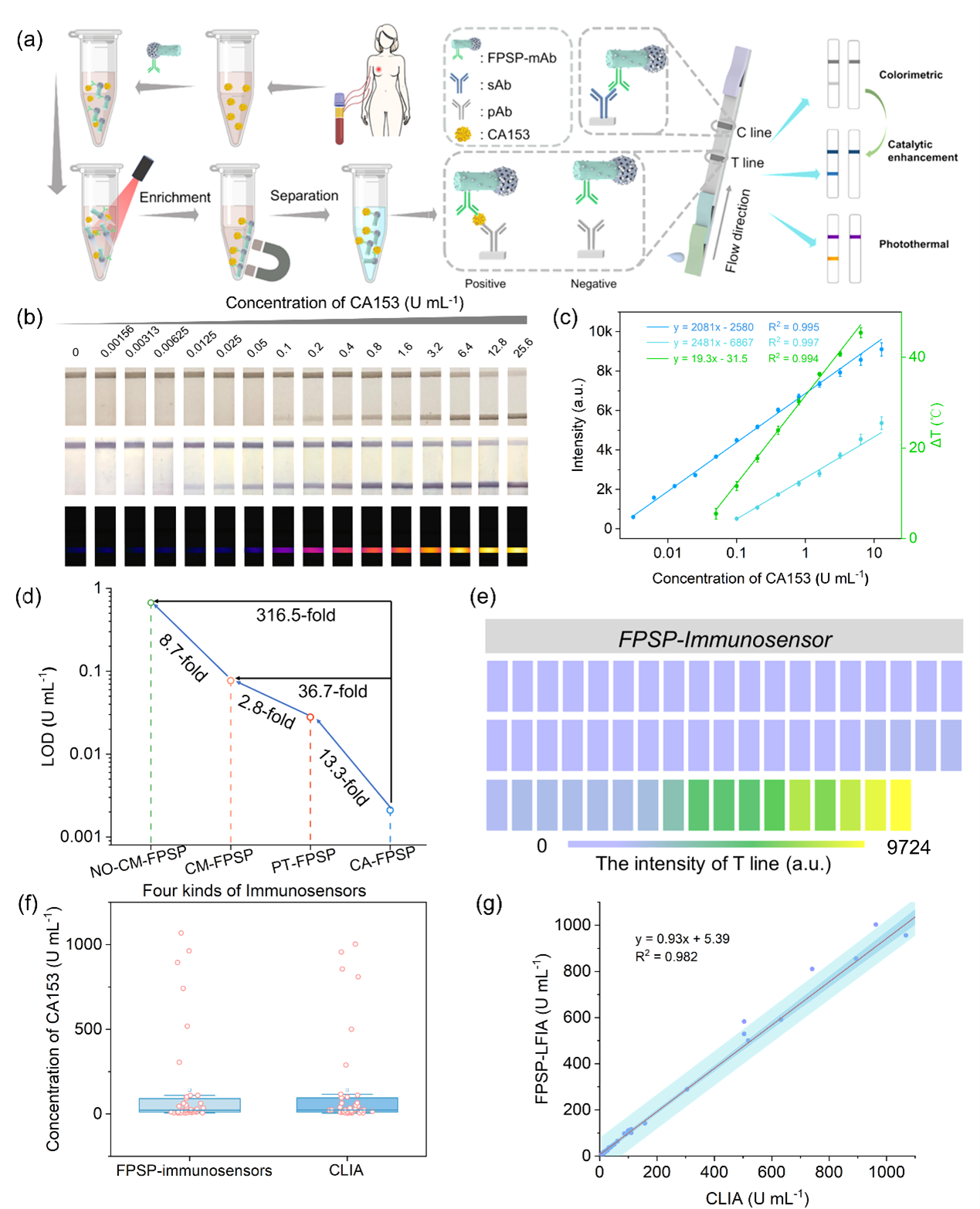 在免疫检测应用中,团队以乳腺癌标志物CA153为模型,将自驱动纳米马达引入双抗体夹心免疫传感体系。红外光照诱导的自主运动显著提高了抗体标记与抗原分子的碰撞概率,使抗原捕获由“被动扩散”转向“主动寻靶”,捕获效率较静态标签提升95.8%。进一步地,纳米马达集成于夹心免疫传感器后实现了运动增强捕获与催化放大读出的协同,检测灵敏度较传统免疫传感器提升316.5倍,最低检测限达到0.0021 U·mL⁻¹,可在短时间内实现血清样本中CA153的高灵敏定量检测;该策略为早期肿瘤标志物检测以及环境监测等场景提供了更高效、更灵敏的免疫分析新方案。