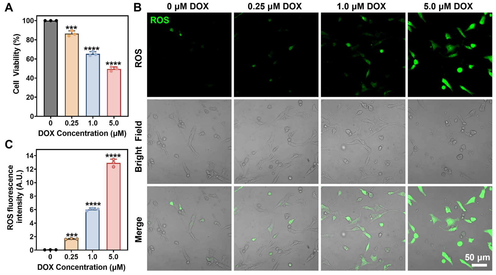 该研究首先在模拟了心肌组织刚度(21.7±0.8 kPa)的聚丙烯酰胺水凝胶上培养大鼠的原代心肌细胞。之后,为模拟不同程度的DOX心脏毒性,分别加入0.25、1.0和5.0 μM的DOX,构建了体外DOX心肌毒性模型。细胞活力与细胞内活性氧(Reactive oxygen,ROS)检测结果显示,随着DOX浓度升高,细胞活力逐步降低,ROS水平显著上升,表明心肌细胞损伤呈剂量依赖性加重,其机制与细胞死亡通路激活及氧化应激增强有关(图2)。