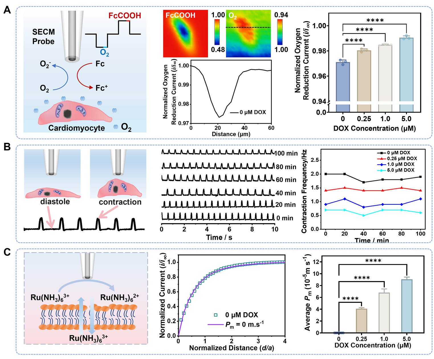 图3.SECM对DOX心肌毒性模型中心肌细胞的(A)呼吸活性;(B)搏动频率;(C)膜通透性的原位表征结果