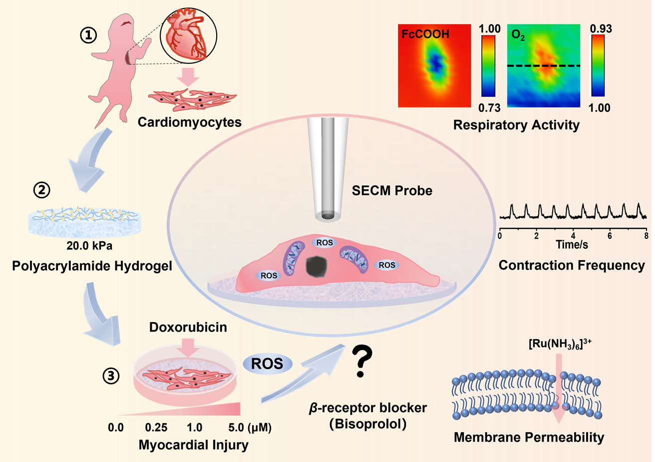 化疗药物引起的心脏毒性是癌症治疗中的不良副反应。治疗中引入心脏保护剂是缓解心脏毒性的重要策略。然而,化疗药物剂量与心脏保护剂在不同阶段对心肌细胞功能的具体影响尚未明确,原因之一是缺乏对药物处理下心肌细胞功能的实时监测手段。扫描电化学显微镜(Scanning electrochemical microscopy,SECM)作为一种微区电化学表征技术,可实时、无损、无标记的监测活细胞的多项功能参数,为研究细胞对药物的响应提供了有力工具。