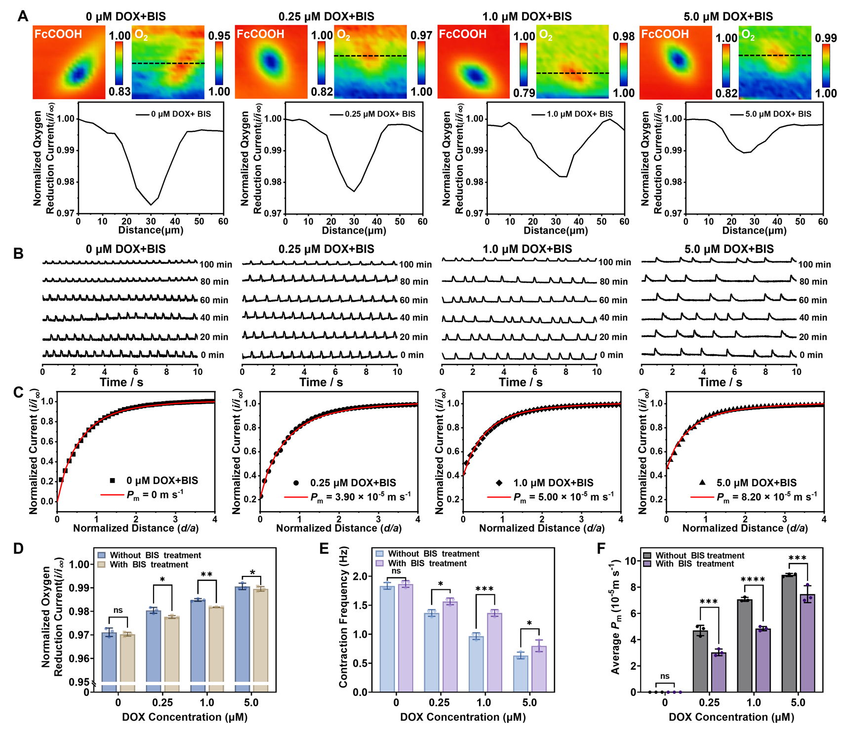 随后,应用SECM原位监测了DOX心肌毒性模型中心肌细胞的呼吸活性、收缩频率和膜通透性。结果显示,在0.25-5.0 μM DOX药物浓度作用下,心肌细胞的呼吸活性和收缩频率显著下降,膜通透性增加,表明DOX通过剂量依赖性的方式对心肌细胞的能量代谢、收缩功能及膜结构造成损伤(图3)。
