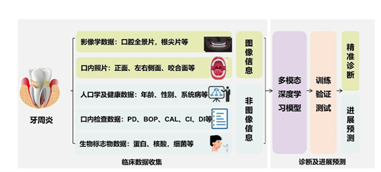 研究表明,通过人工智能模型融合上述多模态信息,能够显著提升牙周炎的诊断准确性、分期精确度以及风险预测能力。例如,融合临床参数与唾液生物标志物的模型,其诊断效能(AUROC)显著高于单一标志物检测;结合人口统计学、行为习惯、影像与生物信息的机器学习模型,在内部验证中显示出超过95%的准确率。人工智能不仅能辅助识别现有疾病状态,还能通过分析细微的影像学变化和生物信号,实现早期炎症的检测与疾病进展的动态监测,从而推动诊断从“滞后判断”向“早期预警与精准干预”转变。