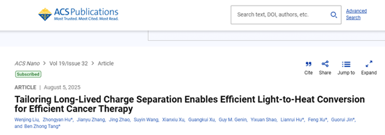 光热疗法(PTT)作为一种局部、精准的肿瘤治疗手段,通过将光能转化为热能来杀死癌细胞,对正常组织损伤小。然而,传统有机光热制剂效率较低,往往需要高功率激光,存在安全隐患,限制了其临床转化。提高光热转换效率是推动该技术发展的关键。西安交通大学仿生工程与生物力学研究所(BEBC)靳国瑞教授、徐峰教授与香港中文大学(深圳)唐本忠院士等在ACS Nano期刊上发表题为“Tailoring Long-Lived Charge Separation Enables Efficient Light-to-Heat Conversion for Efficient Cancer Therapy”的研究论文。