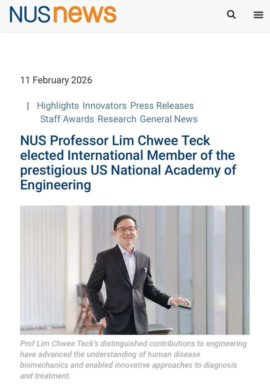 祝贺新加坡国立大学的林水德(CT Lim) 教授获选为美国国家工程院外籍院士!